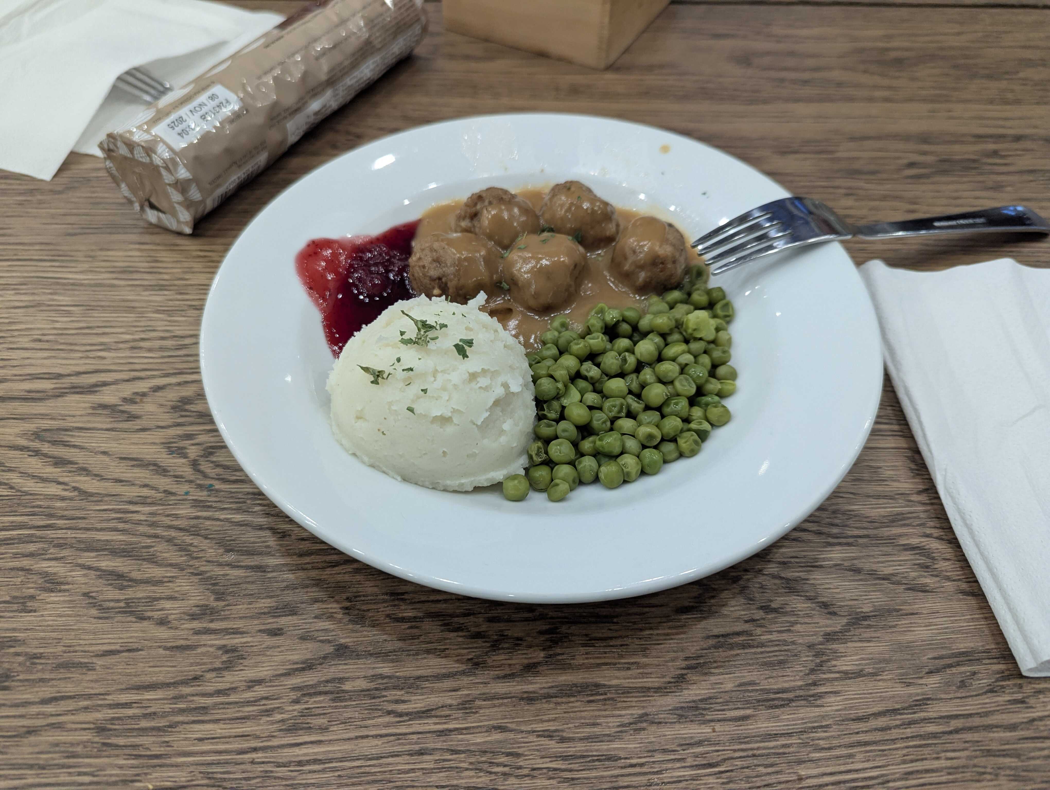 And, of course, dinner, which, according to my journal, is “meatballs, peas, and mashed potatoes with that gravy stuff and the lingonberry jelly”. It was quite delicious, however, they have discontinued the lingonberry juice boxes. I liked those :(.