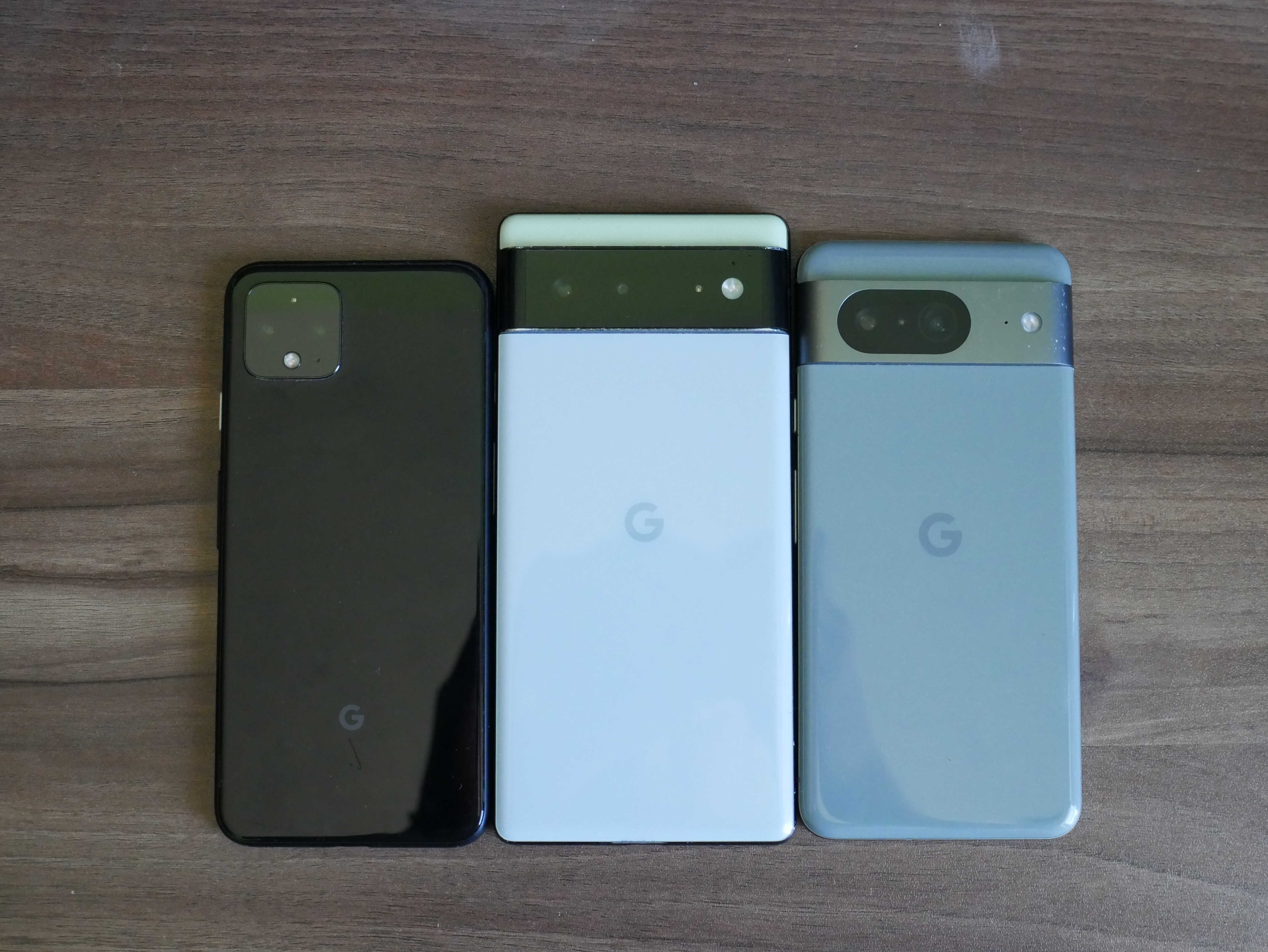 The back of the Pixel 4, Pixel 6, and Pixel 8. The camera does not pick up the green hint on the Pixel 8 that well.