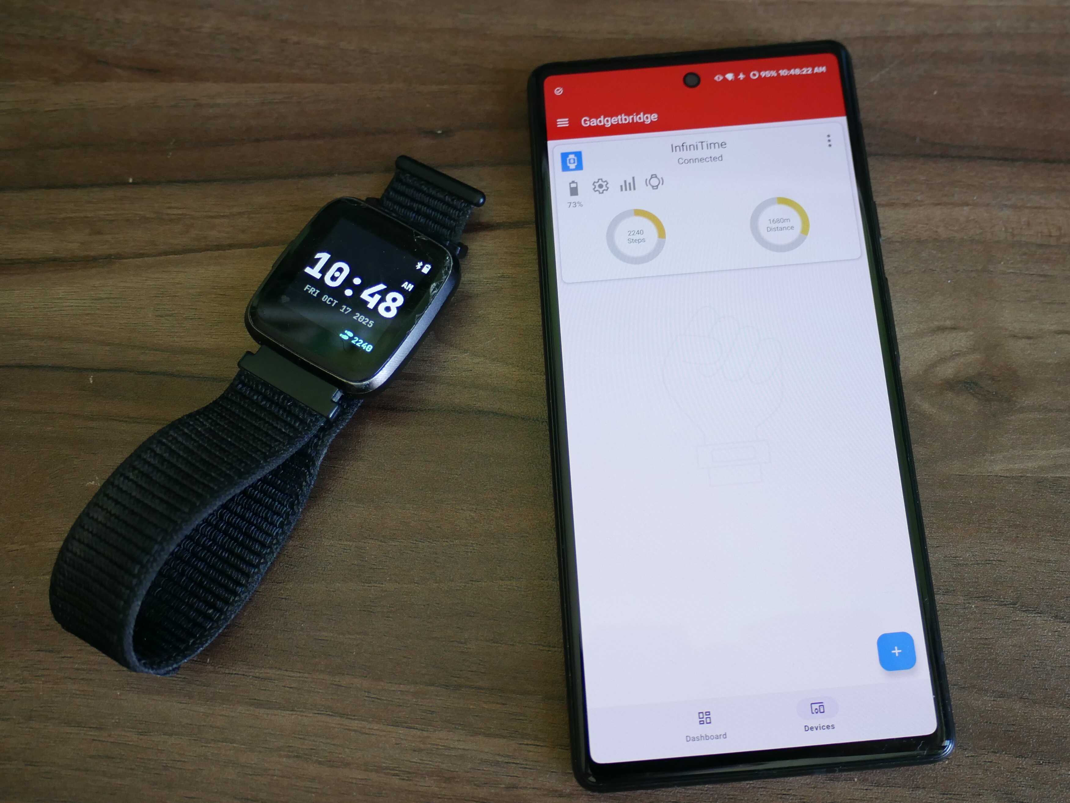 PineTime next to my phone with Gadgetbridge on it. It is worth noting that Gadgetbridge is Android-only.