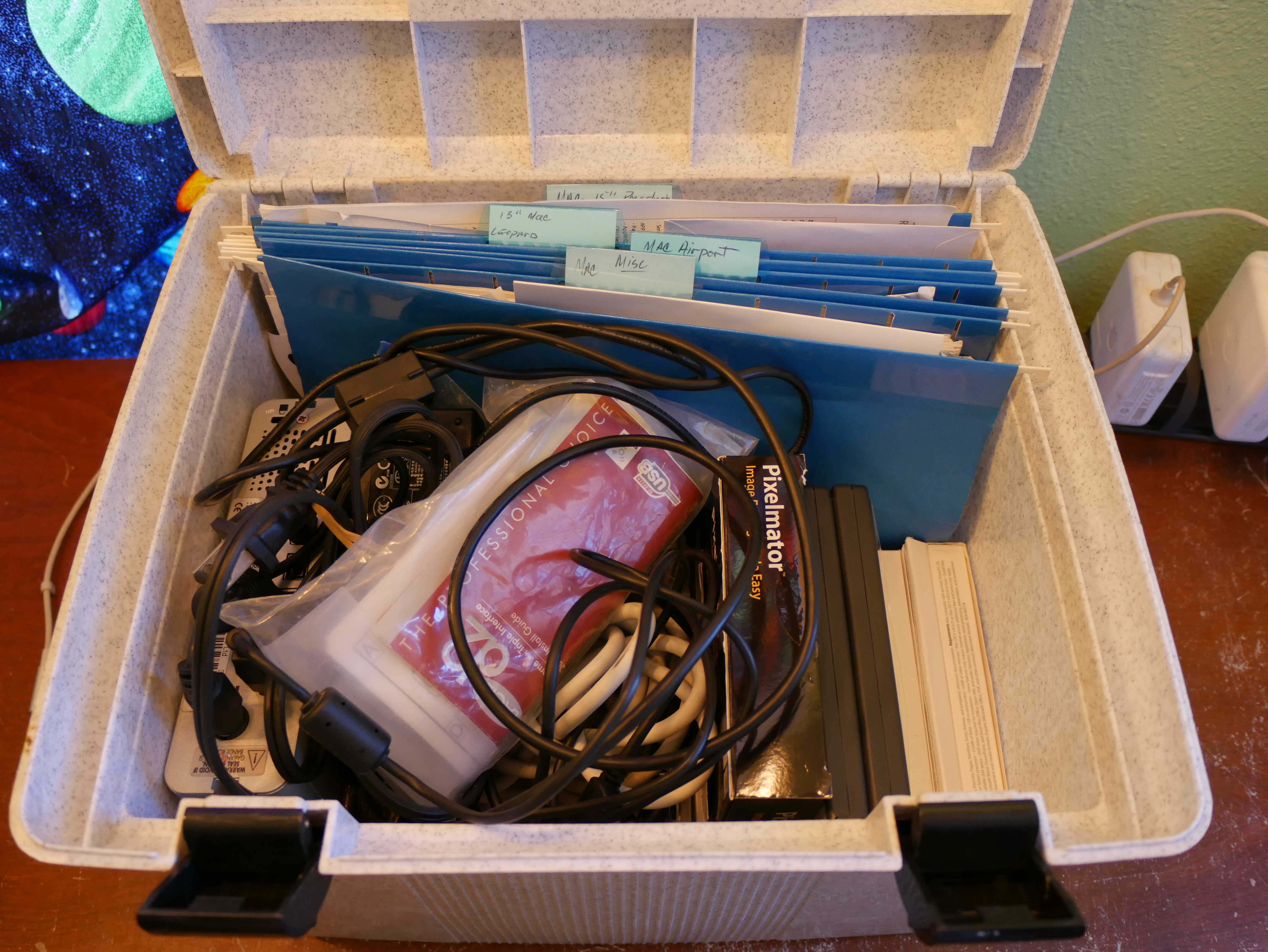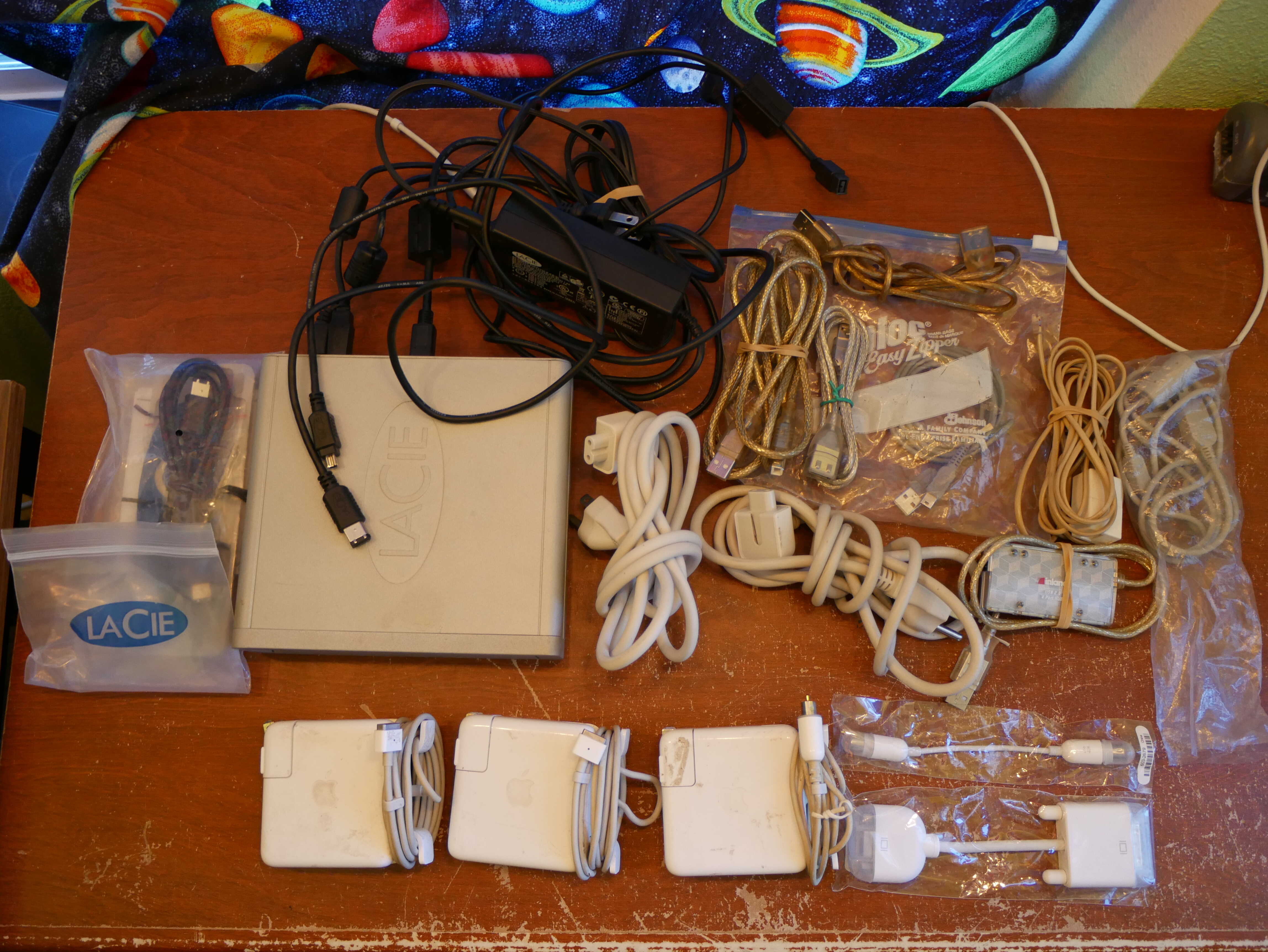 Some of the items in this photo weren’t actually in the chest, specifically the three chargers. Those were in a trash bag, along with a Apple Magic Mouse (an old one that takes AA batteries).