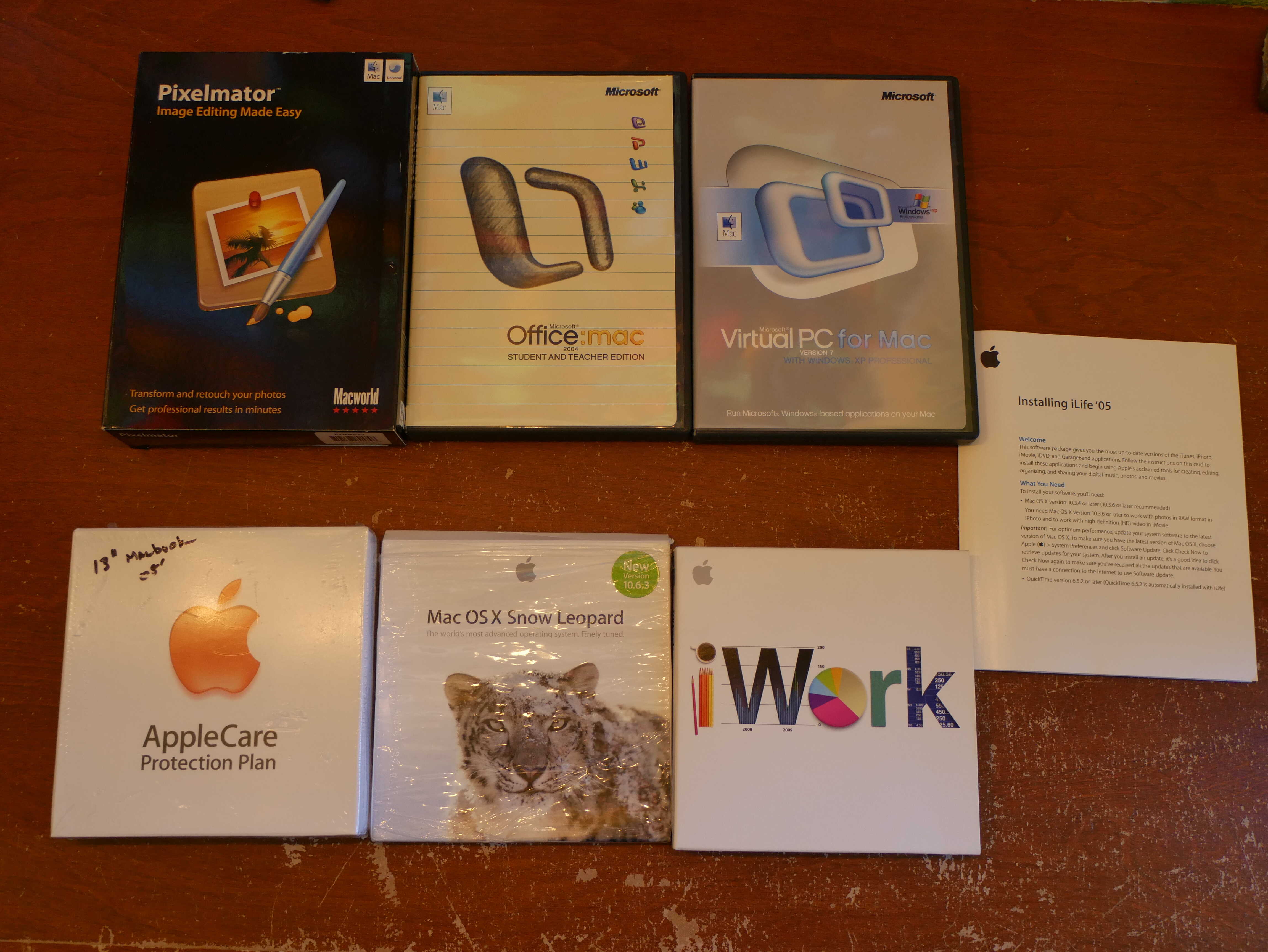 From left to right, top row first: Pixelmatos, Office for Mac 2004, Virtual PC for Mac version 7, AppleCare, Mac OS X Snow Leopard (10.6.3), iWork '09, and iLife '05.