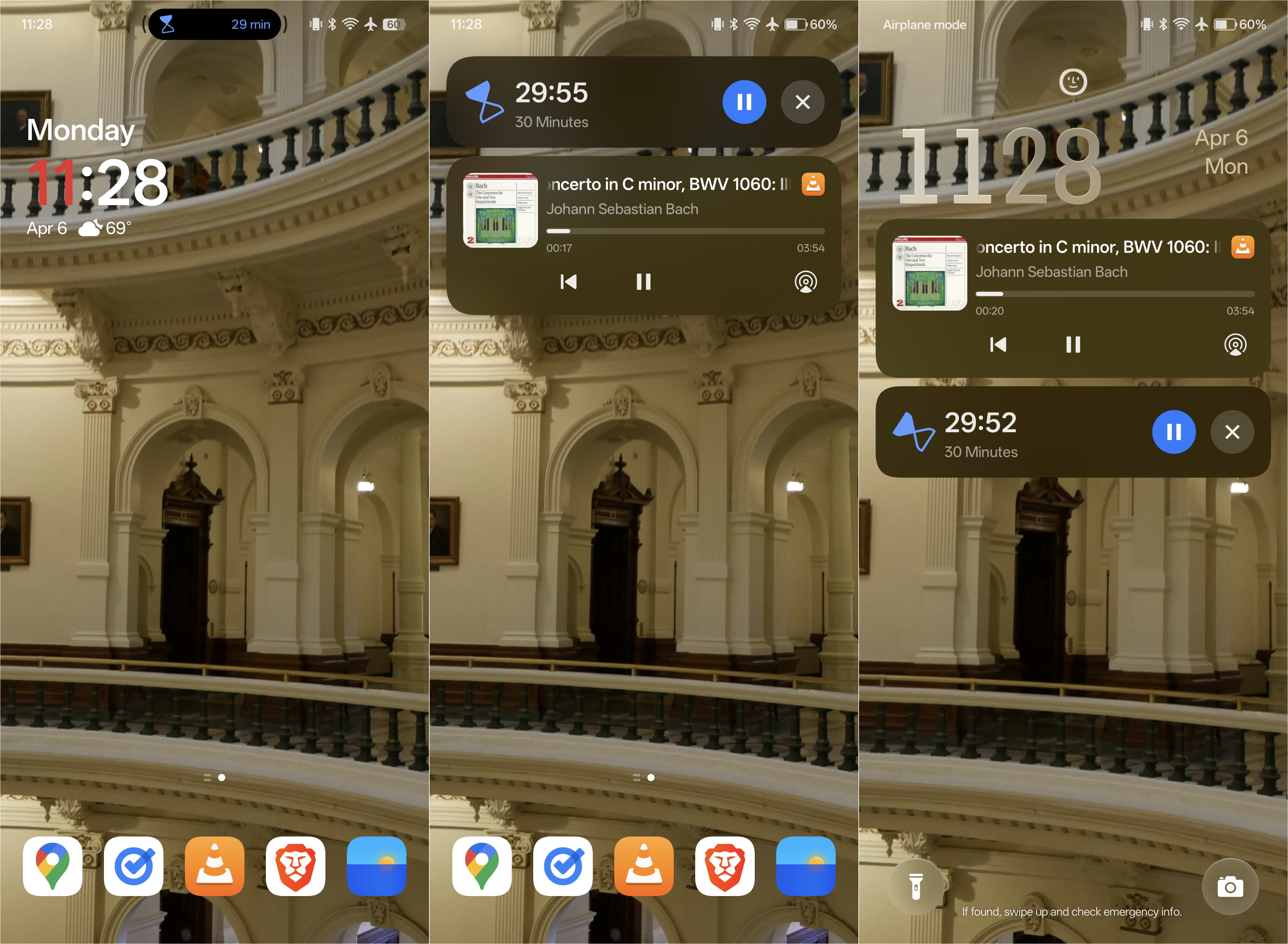In fact, this phone tries so hard it’s even got a Dynamic Island. They call it Live Alerts but we all know what it is. It works with very little right now. Media playback, timers, Google Maps, and a couple other things are about the only things it does. As apps add Live Alert support they’ll slowly start to appear in the Island. It’s been useful when an app supports it. Also, if there’s multiple Live Alerts, there’ll be these little parentheses around the Alert that’s showing. Tap it and you can see both. It’s really nice.
