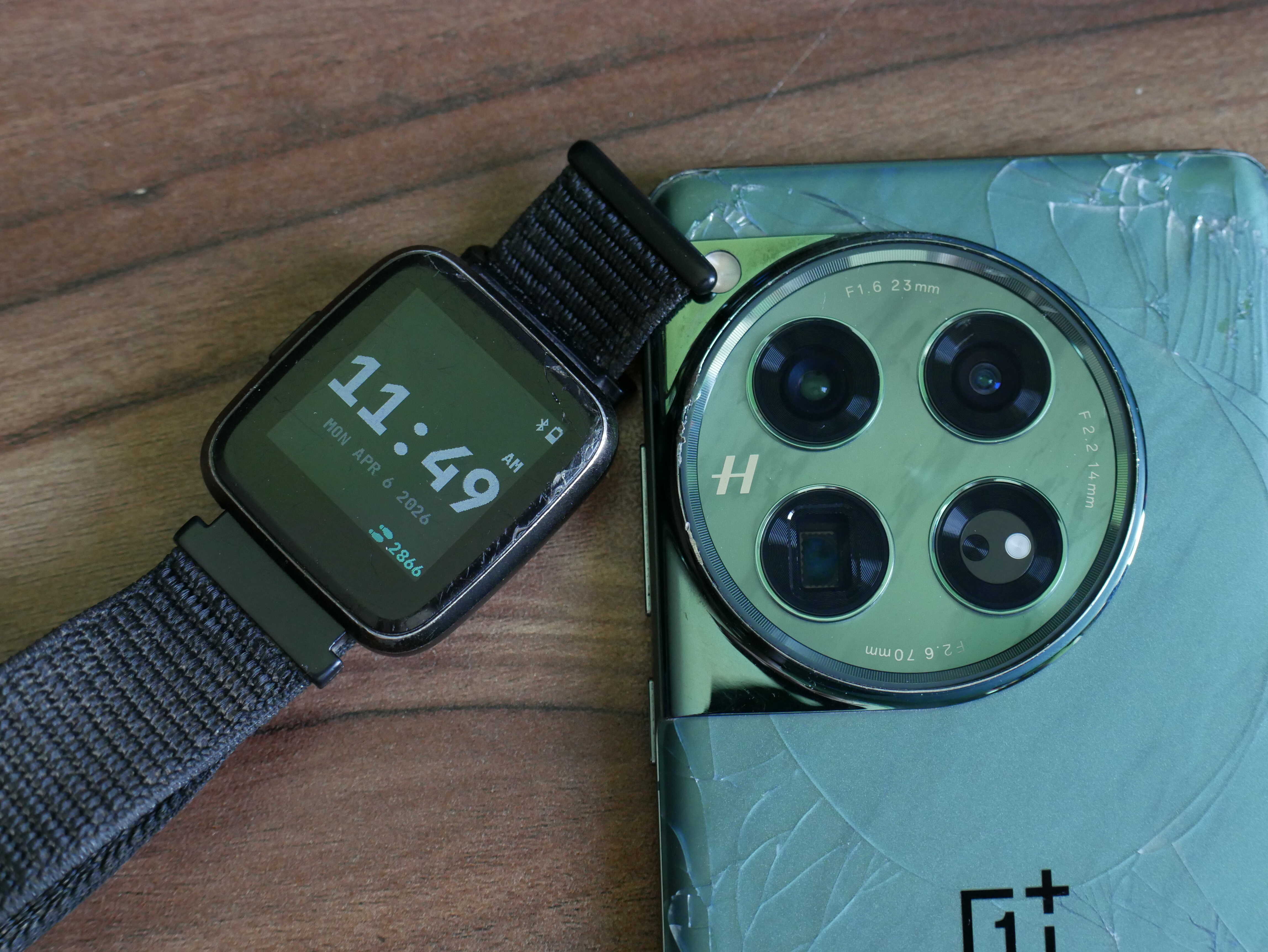 The camera plateau of the OnePlus 12 and the face of my PineTime.